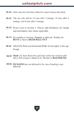 10-13: No stealing or bunting. Slapping is allowed. Penalty for